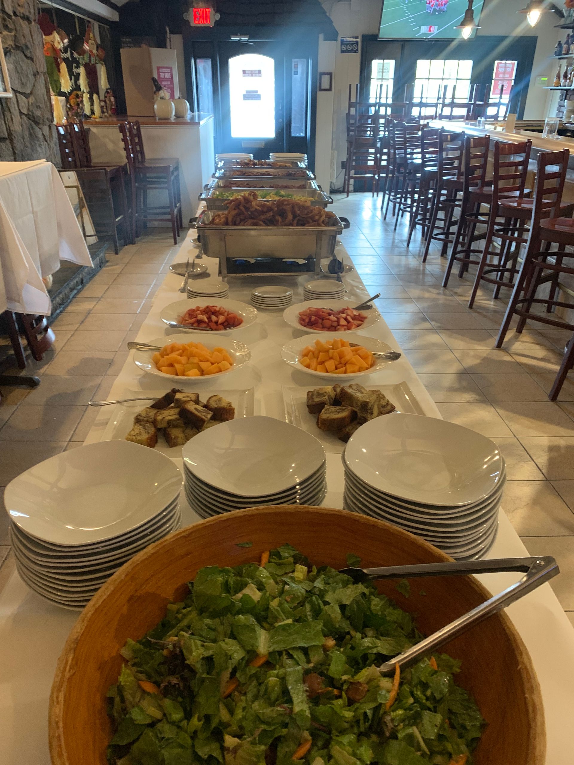 Buffet includes three chafing dish entrees, choice of starch, and market fresh vegetable. Fresh bread and water provided for all the tables.